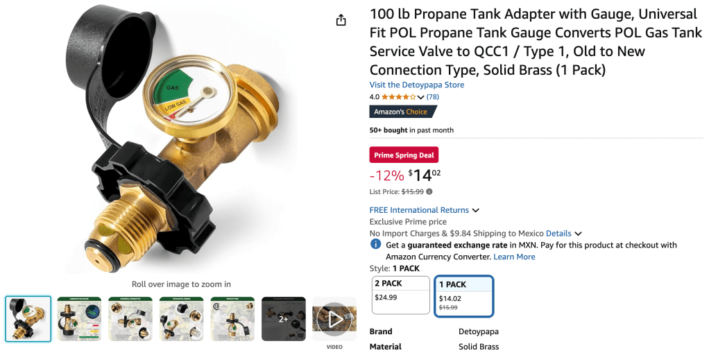 Purchasing this adaptor from Amazon allows you to connect the Mexican propane tank with your valve system. I like this particular adaptor because it includes a gauge to check your propane tank levels.